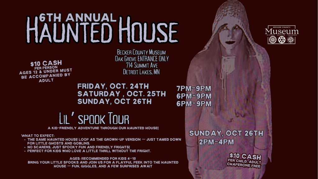 We are back for the 6th Annual Haunted House. This year we will be in-house at the Museum! Run dates are October 24th from 7-9pm and October 25th & 26th from 6pm-9pm!