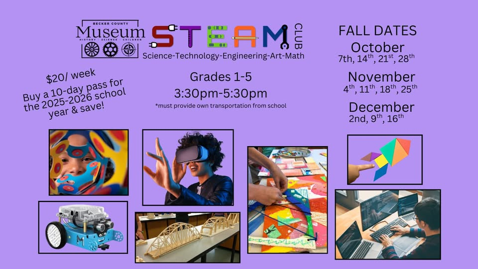 You must register by the Friday before to reserve your space or save time and register all dates at once. To register utilizing your punchcard, contact us at 218-847-2938 or email Bethany@beckercountymuseum.org