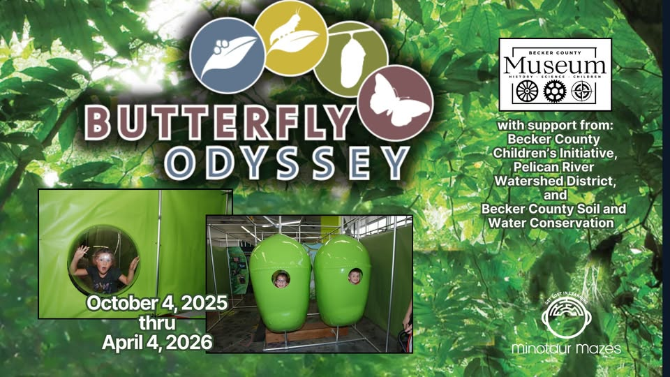 The Becker County Museum presents Butterfly Odyssey: Saving rainforests, one flap at a time with financial support from Becker County Children’s Initiative, Pelican Water Shed District and Becker County Soil and Water Conservation District. The exhibit will be at the Becker County Museum October 4th, 2025 -April 4th, 2026.
